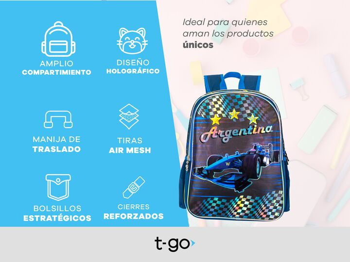 Las nuevas mochilas escolares de T-GO unen fabulosos diseños con resistencia. Poseen un amplio compartimiento principal, 3 bolsillos secundarios y están confeccionadas con materiales de primera calidad y costuras reforzadas para una larga duración. CARACTERÍSTICAS PRINCIPALES -Compartimiento princip...