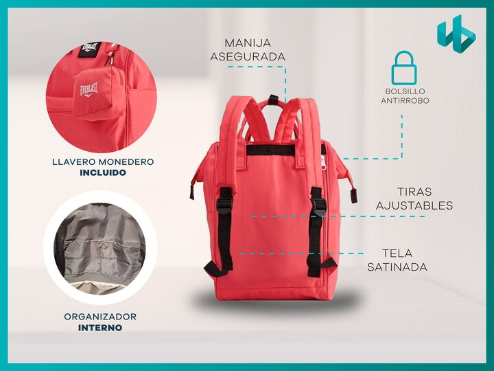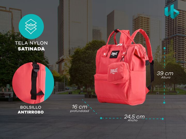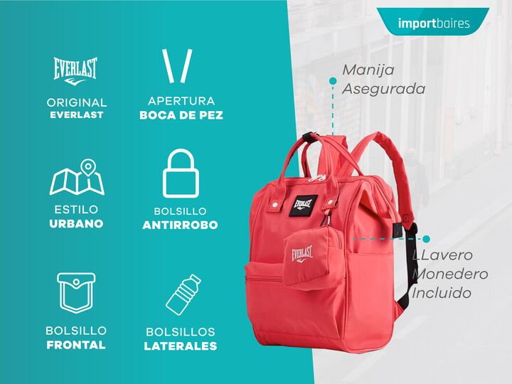 Hermosa mochila urbana de Everlast. Cuenta con varios bolsillos para que todo vaya organizado, un monedero desmontable de regalo y una apertura boca de pez para un fácil acceso a tus pertenencias. CARACTERÍSTICAS PRINCIPALES -Compartimiento principal con capacidad para una notebook de 14 pulgadas (n...