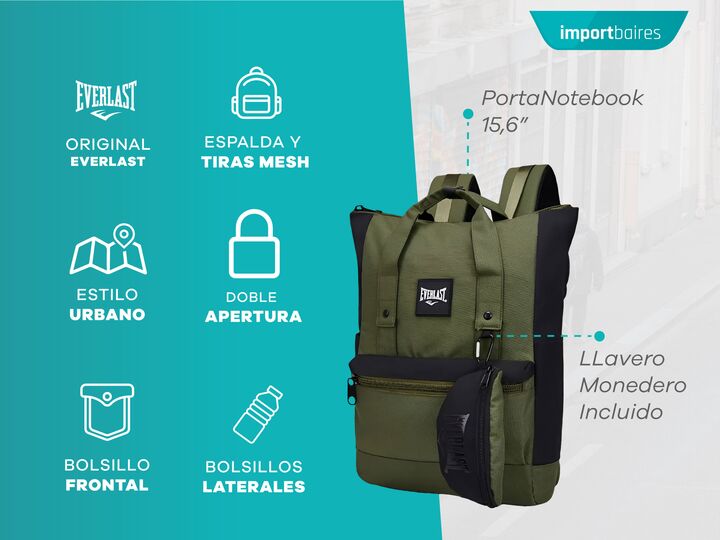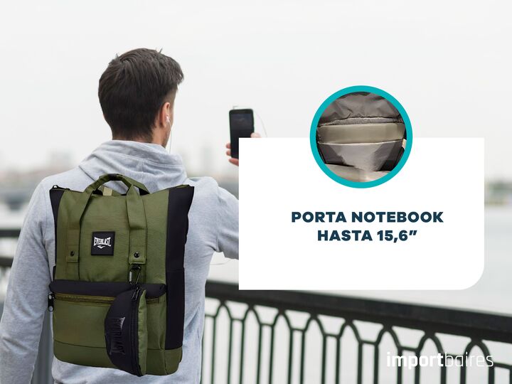 MOCHILA EVERLAST PARA MUJER HOMBRE - PORTA NOTEBOOK 15.6 PULGADAS • Espacio separador especial para notebook hasta 15.6 • incluye monedero con gancho mosquetón • Apertura de mochila doble ( al frente y en la espalda ) • Tamaño de capacidad ideal para uso urbano, viajes y paseos • Ajuste pectoral fro...