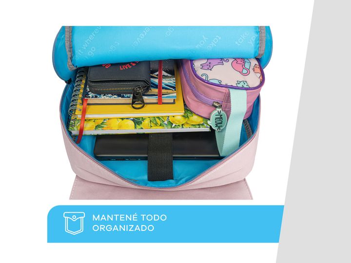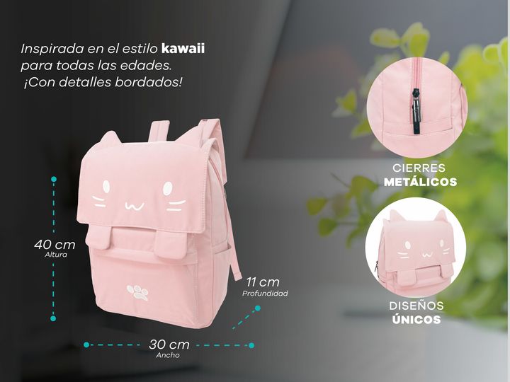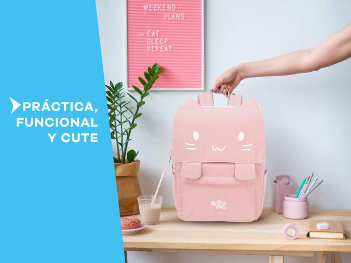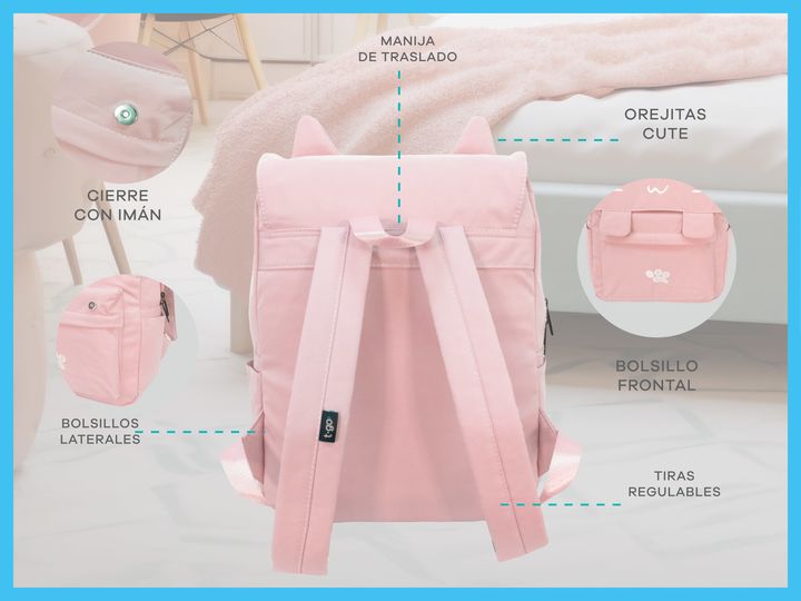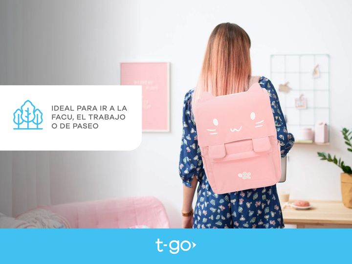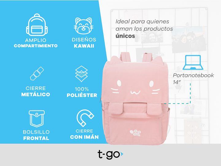 MOCHILA T-GO GATITO KAWAII CON PORTA NOTEBOOK Diseño exclusivo: Mochila con detalles bordados de carita de gatito y orejas en relieve. Incluye un toque único con un diseño de huellita bordada y trabas frontales con imán. Gran capacidad: Compartimento principal espacioso para guardar libros, cuaderno...