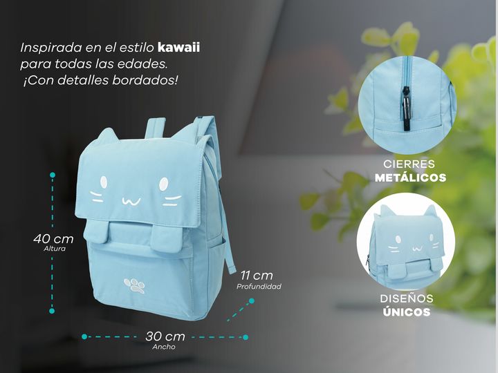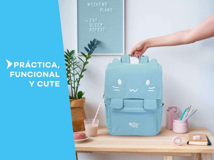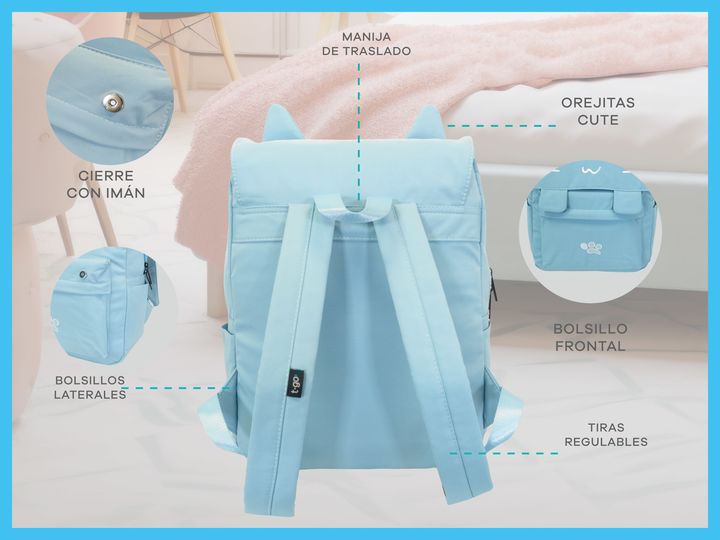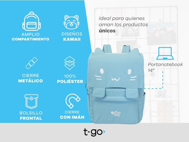 MOCHILA T-GO GATITO KAWAII CON PORTA NOTEBOOK Diseño exclusivo: Mochila con detalles bordados de carita de gatito y orejas en relieve. Incluye un toque único con un diseño de huellita bordada y trabas frontales con imán. Gran capacidad: Compartimento principal espacioso para guardar libros, cuaderno...