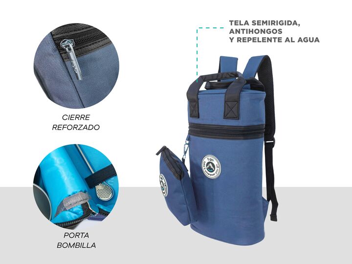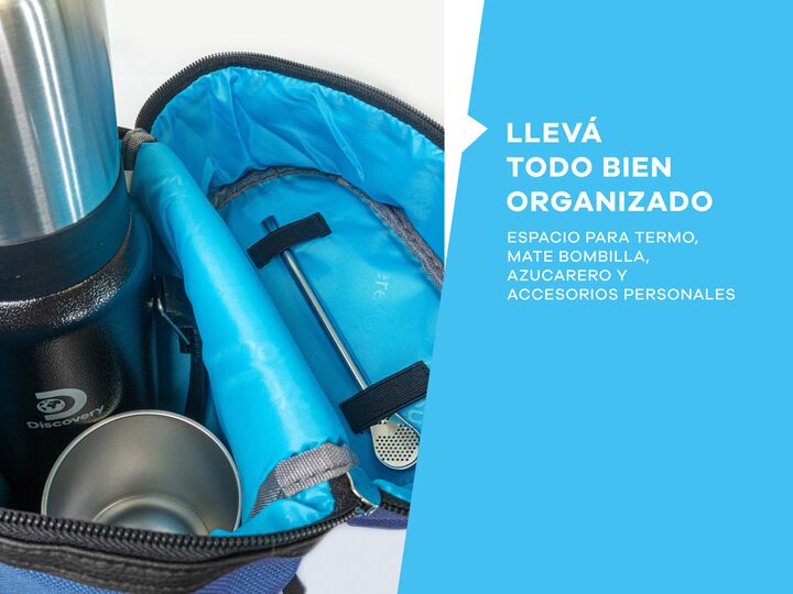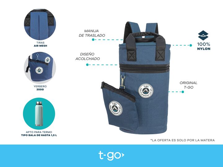 MOCHILA MATERA T-GO CON YERBERO DE REGALO Tu matera T-go tiene espacio para tu set matero con un termo de hasta 1,5 litros, es acolchado para que todo viaje seguro y trae una yerbera de regalo con gancho para llevar colgado + un novedoso porta bombilla CARACTERÍSTICAS PRINCIPALES -Compartimiento pri...