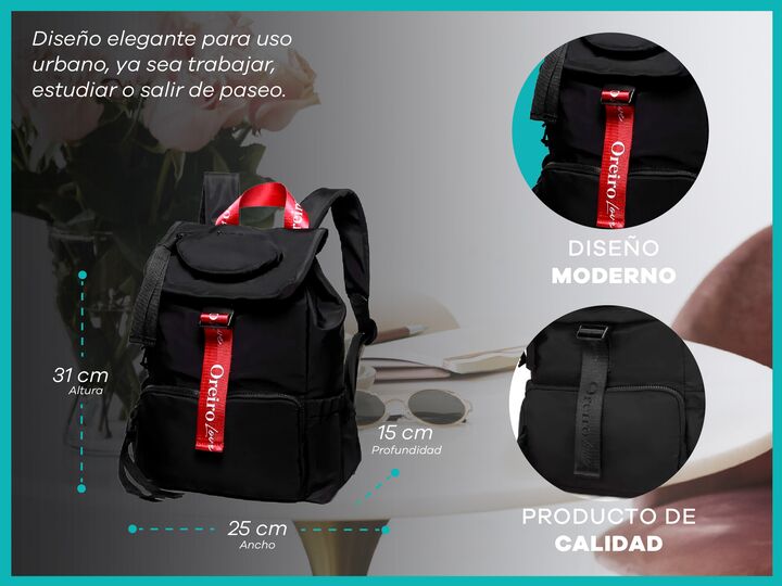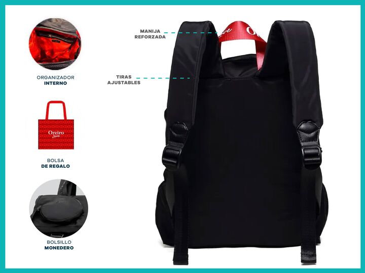 MOCHILA NEGRA DE MUJER OREIRO LOVE URBANA REFORZADA -Espacio para llevar un cuaderno universitario, un dispositivo de hasta 12 pulgadas o un neceser de 27 x 20 cm, entre otros. -Múltiples bolsillos pequeños: laterales, organizadores, interno con cierre, frontal, superior externo e interno. -Portalla...