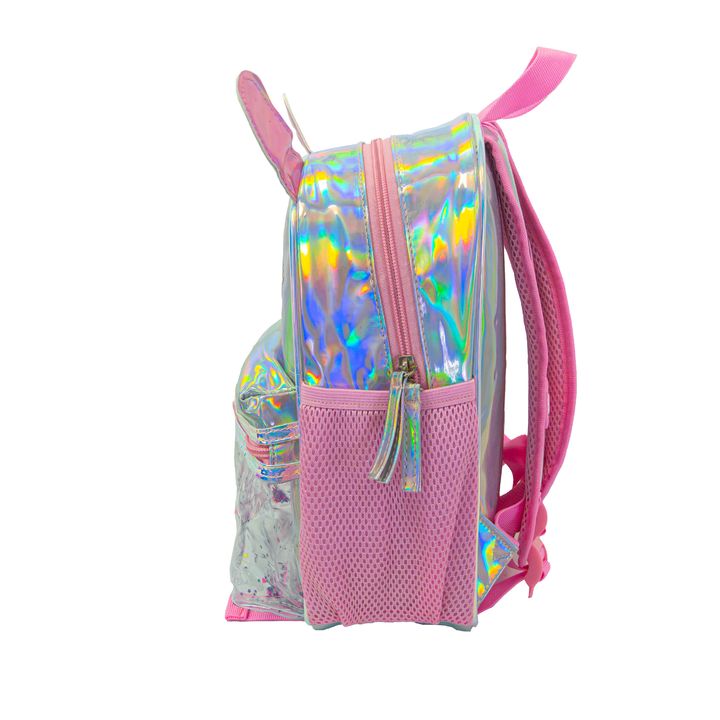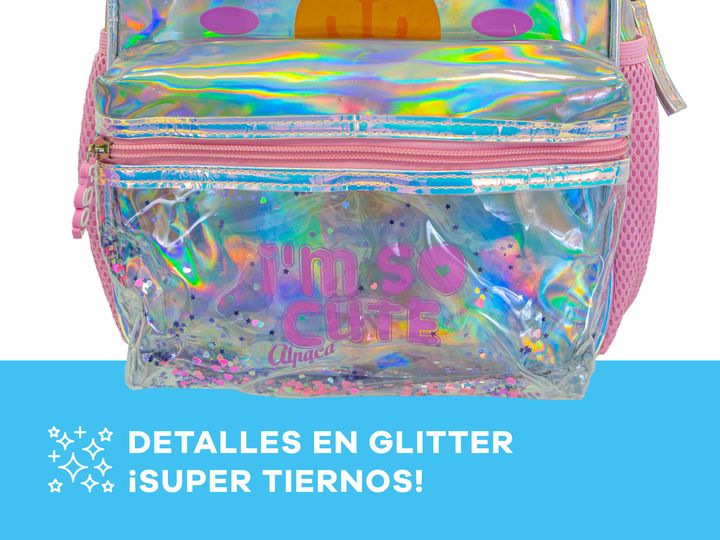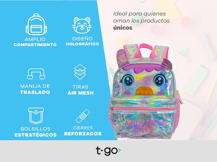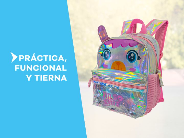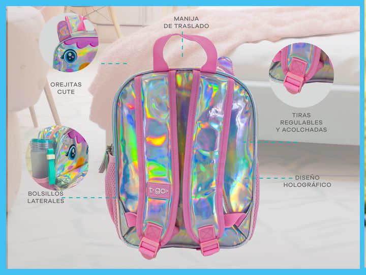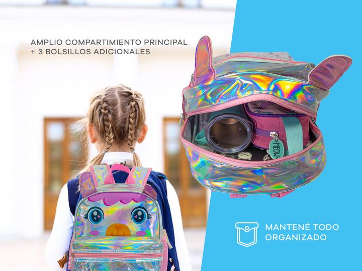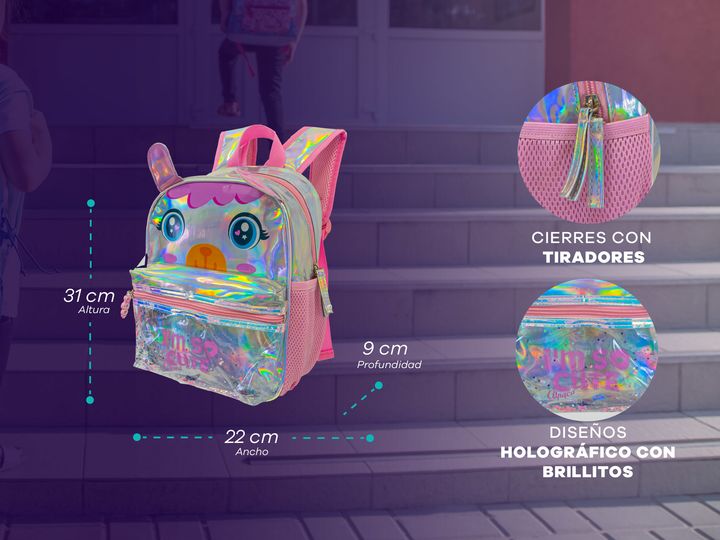 MOCHILA INFANTIL TORNASOLADA -Compartimiento principal con espacio para todos los elementos que precisan llevar. -Bolsillos laterales para accesorios. -Bolsillo frontal transparente. -Liviana. -Impermeable. -Cierres resistentes con tiradores de silicona para un rápido acceso. -Tiras ajustable. -Fabr...