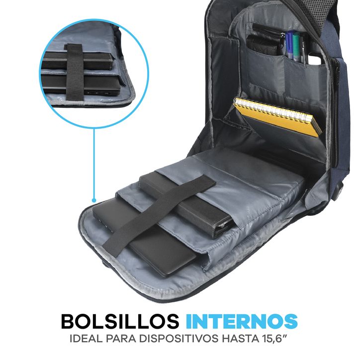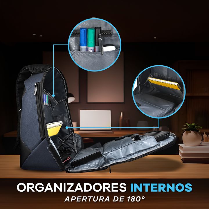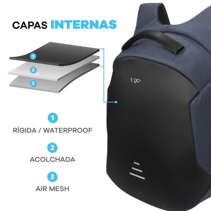 MOCHILA EJECUTIVA T-GO LINEA PREMIUN PORTANOTEBOOK USB - No incluye Powerbank - Espacio Separador para notebook hasta 15.6 con tira de velcro - Organizadores internos para pequeños objetos - Pequeño bolsillo interno con cierre - Bolsillo en espalda - Pequeños Bolsillos laterales para pequeños objeto...