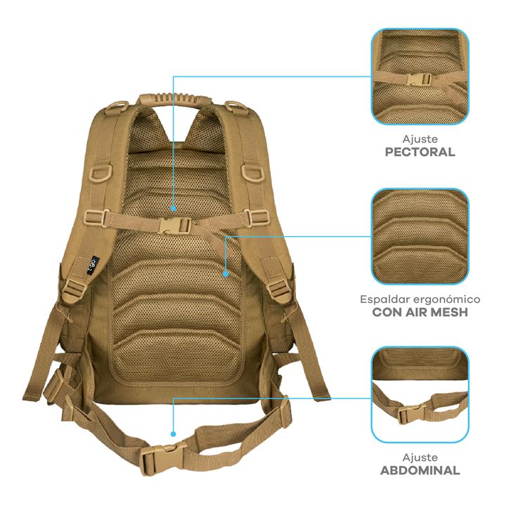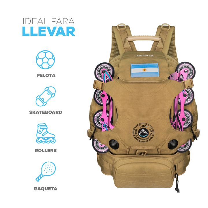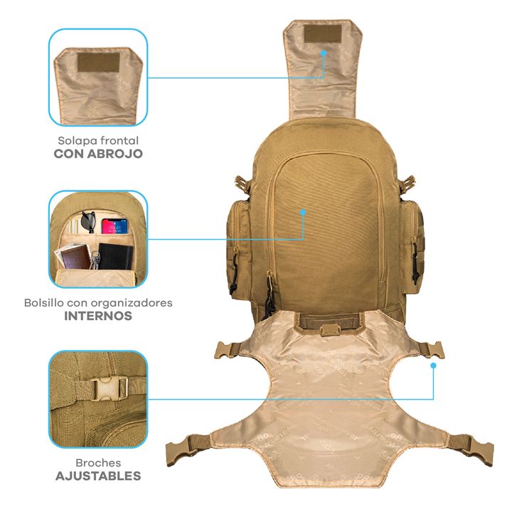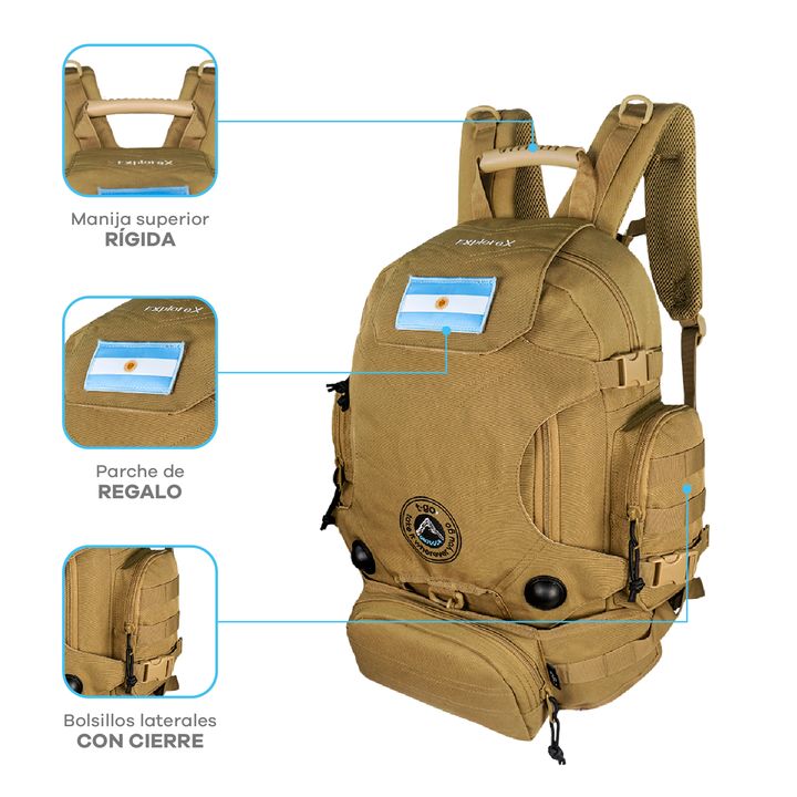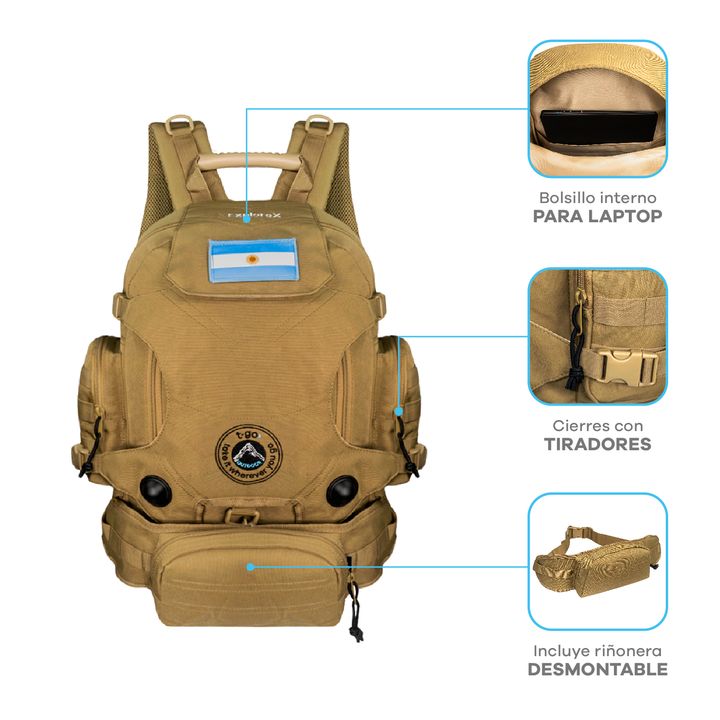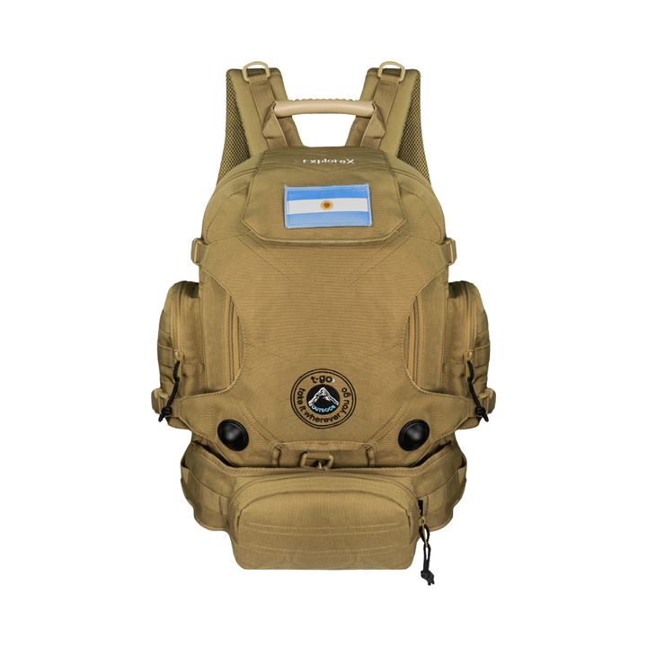 MOCHILA TÁCTICA T-GO EXPLORE X 2 EN 1 INCLUYE RIÑONERA DESMONTABLE -Capacidad: 35 litros. -Amplio compartimiento principal. -Bolsillo secundario frontal con compartimentos internos. -Bolsillos laterales con cierre. -Manija superior rígida. -Solapa frontal con velcro y broches laterales, ideal para l...