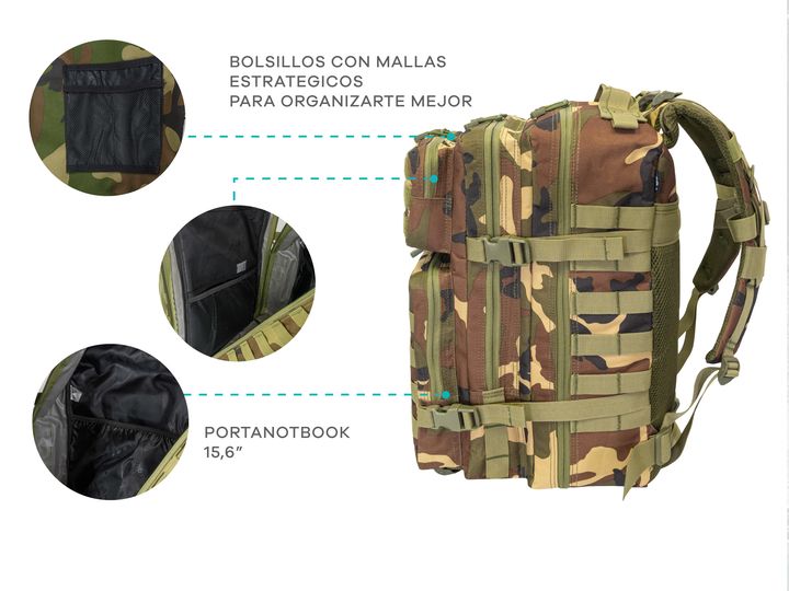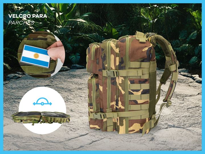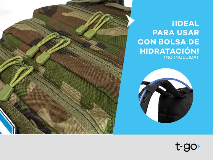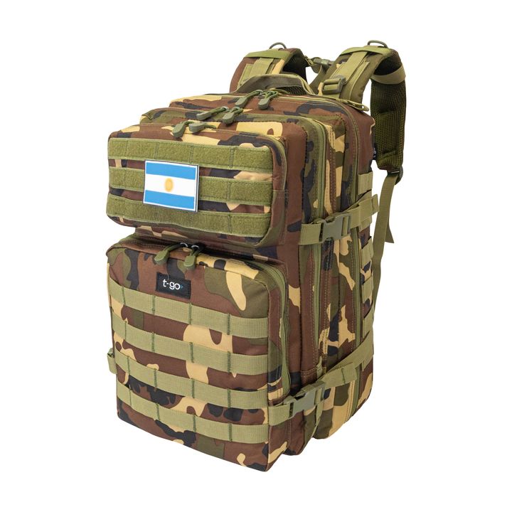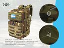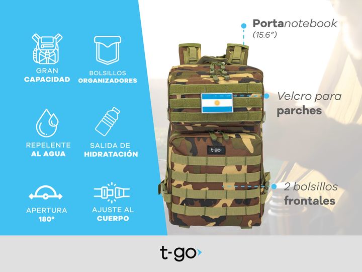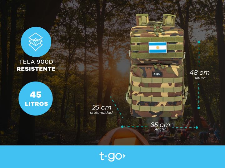 MOCHILA T-GO TÁCTICA 45 LITROS CON ESPACIO PARA NOTEBOOK CARACTERÍSTICAS PRINCIPALES -Gran capacidad de carga: 45 litros -Doble bolsillo frontal con doble cierre y tiradores. -Novedoso bolsillo grande en espalda con cierre .de velcro -Compartimiento principal separador notebook. Bolsillo mediano con...