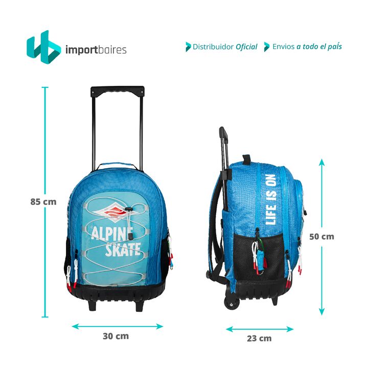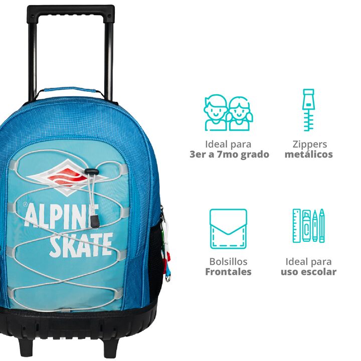 MOCHILA ESCOLAR CON CARRITO ALPINE SKATE DE 18 PULGADAS - Mochila con carrito, con dos ruedas o tres ruedas dependiendo el modelo - Amplio compartimiento central con doble cierre y tiradores de goma - Bolsillos laterales - Medida : 43cm alto x 30cm ancho x 15cm profundidad - Bolsillo frontal para ac...