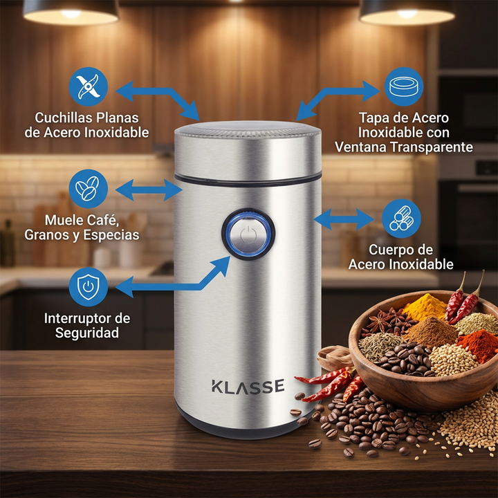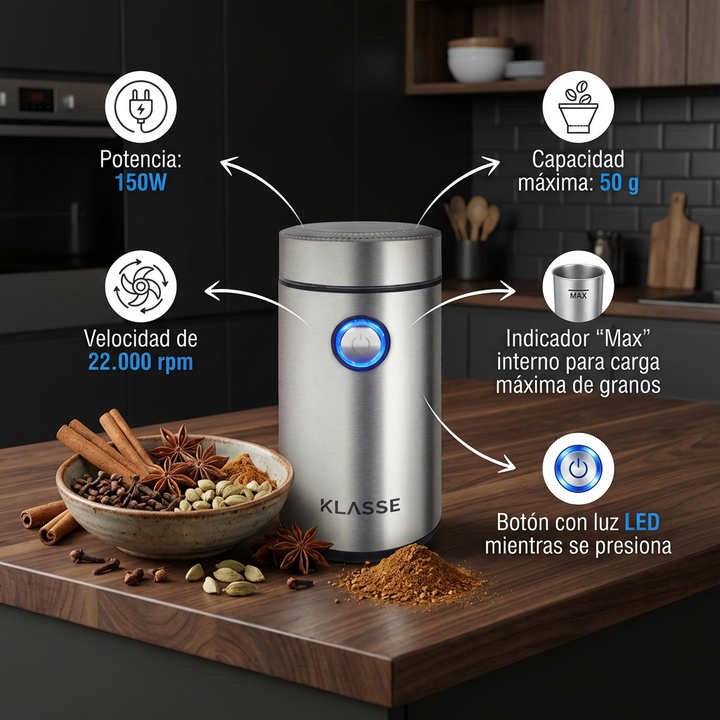 El molinillo de café acero inoxidable led klasse está pensado para moler café y otros ingredientes secos con practicidad.