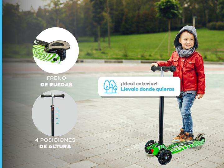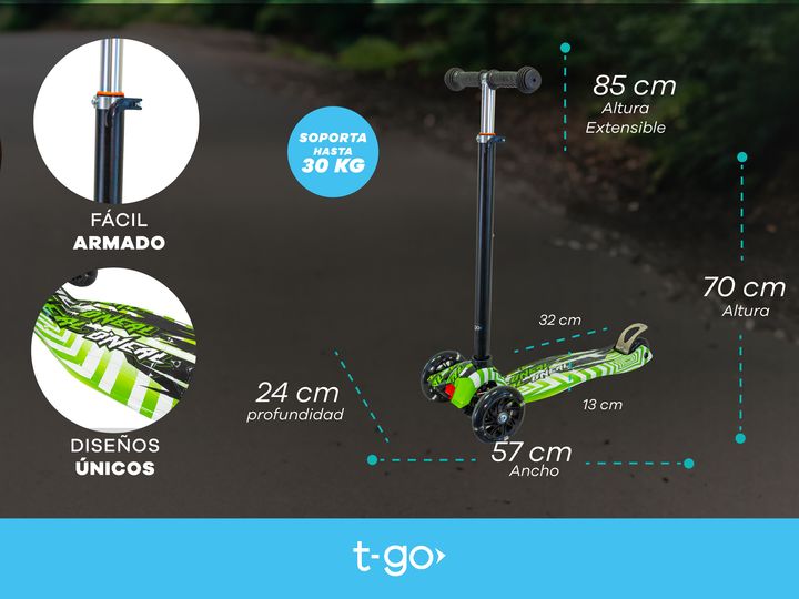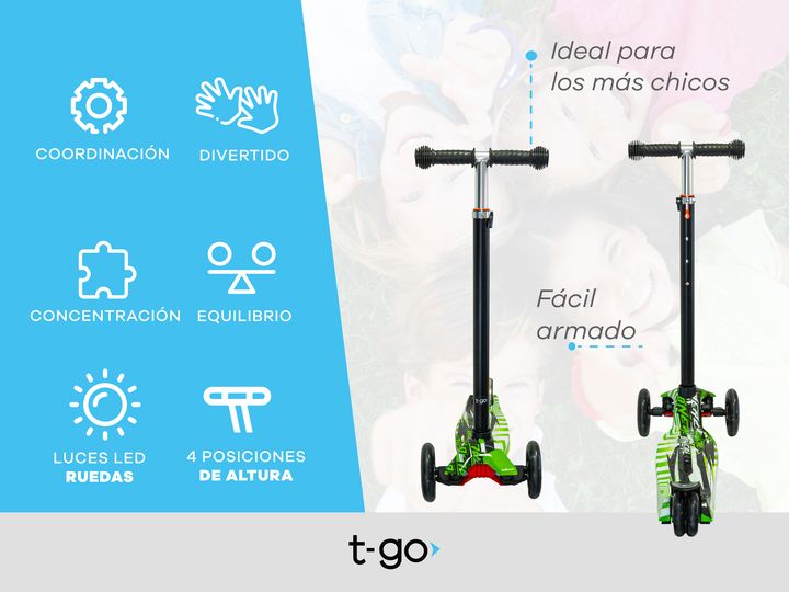 MONOPATÍN T-GO 4 RUEDAS URBAN KIDS CON LUCES - Edad recomendada: Hasta 14 años - Peso soportado: Hasta 60 KG - Luces led en las ruedas que se activan por aceleración - 4 alturas regulables (70 cm, 75 cm, 80 cm, 85 cm) - Material resistente y duradero para soportar el uso diario - Ruedas resistentes ...