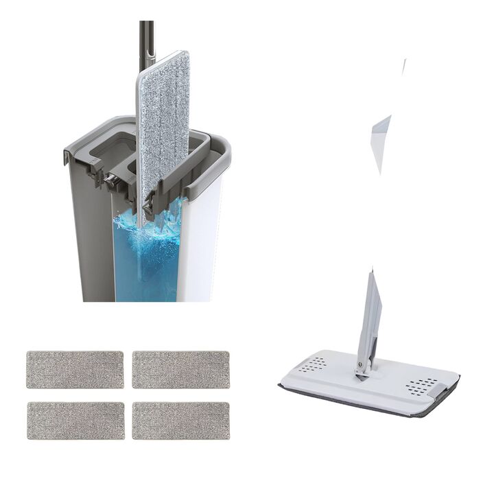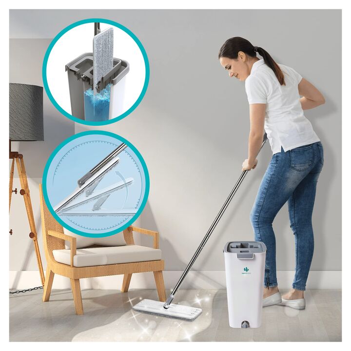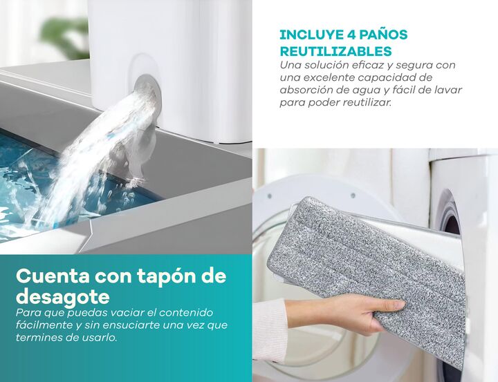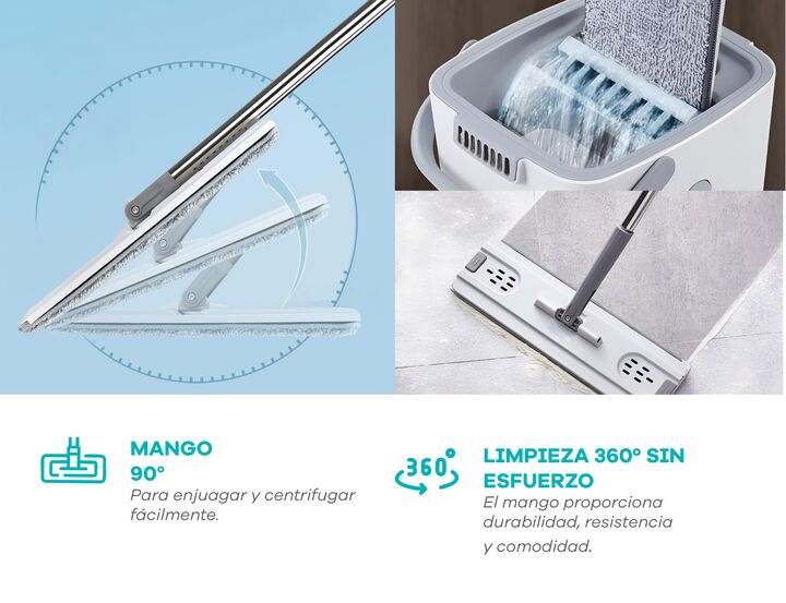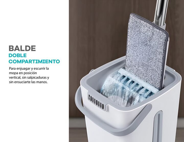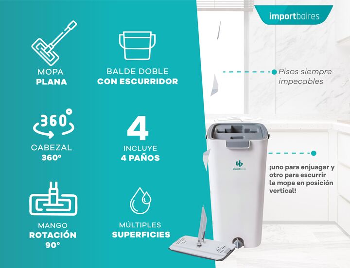 Mopa Plana lampazo Importbaires con doble balde y escurridor. Incluye 4 paños de microfibra reutilizables. Porque todos merecemos un hogar limpio sin tener que renegar con trapos viejos, baldes incómodos o dolores de espalda. Esta mopa plana fue diseñada como una solución para volver tu rutina de li...