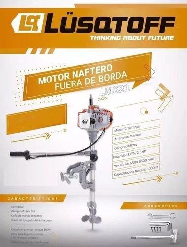 MOTOR FUERA DE BORDA LUSQTOFF LM621 P/ LAGUNA 2T 2.5HP 62 CC LM621 • Diseñado para instalarse en el montante de la popa de embarcaciones de pequeño tamaño. • Puede pivotarse horizontalmente de manera que sirve como timón, incluso con el motor apagado para dirigir la navegación. • Refrigerado por air...
