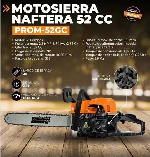 MOTOSIERRA NAFTERA LUSQTOFF PROM-52 GARDEN PLUS 2T 11000RPM PROM-52 La Motosierra 52 Cc Camuflada Garden Plus By Lusqtoff es la herramienta perfecta para aquellos que buscan eficiencia y comodidad en sus tareas de jardinería y mantenimiento de espacios verdes. Con su potente motor de 25 hp y una cil...