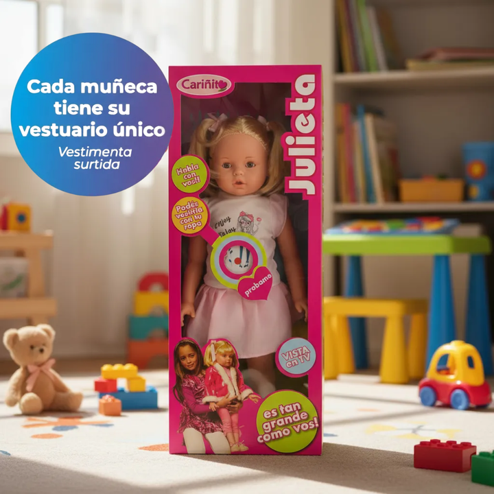 Muñeca Cariñito Julieta 85cm 12 frases varios vestuarios Articulada en brazos y piernas. Habla con tu muñeca! Contiene 12 tipos de frases diferentes Convertí a Marícela en tu mejor amiga! Cada presentación tiene un vestuario único e inigualable. Las prendas son surtidas/aleatorias.