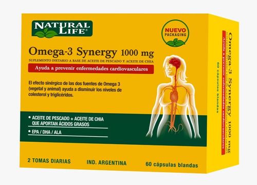 Natural Life Omega 3 Synergy Chia + Fish Oil X 60 Capsulas La combinación del omega-3 vegetal proveniente dde la Chia (ALA) y el Omega-3 del pescado (EPA y DHA), crea un efecto sinérgico, potenciando su acción en la ayuda a disminuir el colesterol y los triglicéridos. Posee ácidos grasos que además ...
