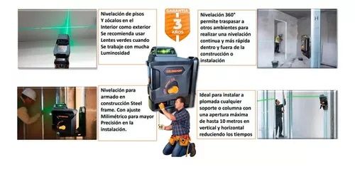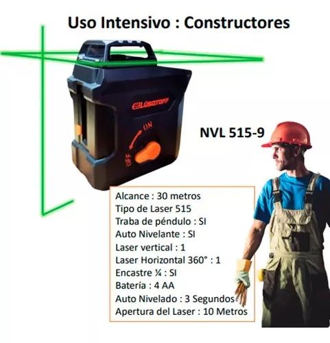 NIVEL LASER LUSQTOFF NVL515-9 AUTONIVELANTE 360° VERDE 515MM NVL515-9 Luz verde, haz de luz, tecla de encendio y apagado, traba péndulo, base imantada, medidas 360° y alcance de 30 mts. - Cantidad de lineas: 2 - Cobertura de propagación horizontal: 360° - Cobertura de propagación vertical: 130° - Ra...
