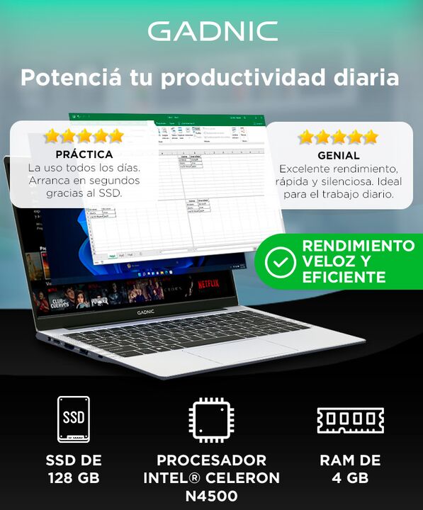 Rendimiento eficiente para tareas diarias: La Notebook Gadnic 14 Intel Celeron N4500 ofrece un desempeño ideal para estudio, navegación y trabajo en la nube. Su arquitectura optimizada permite ejecutar múltiples tareas básicas sin interrupciones. Almacenamiento SSD de 128GB para mayor velocidad: El ...