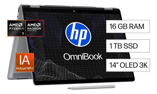 Notebook HP OmniBook XFlip NGAI 14-fk0072la (BM2L9LA) IA para Cuidar tu Privacidad en 360° Nueva HP OmniBook X Flip 14 Next Gen AI PC. Con el lápiz inteligente crea en la pantalla OLED 3K, rendimiento con 14 horas de duración de batería y seguridad con Windows Hello. Diseño premium con Inteligencia ...