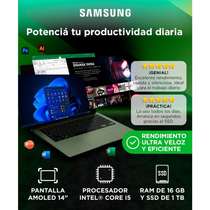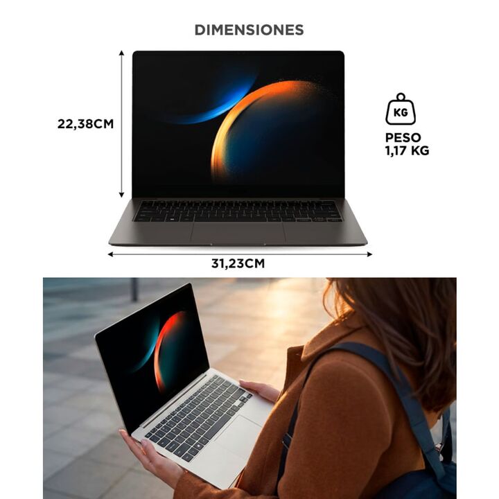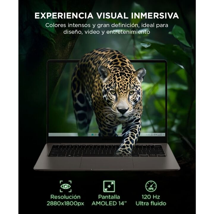 Pantalla AMOLED 3K de alto impacto visual: La Notebook Samsung Galaxy Book3 Pro 14 ofrece una pantalla WQXGA+ de 2880×1800 píxeles con tecnología AMOLED y 120 Hz. Ideal para trabajar, mirar contenido y disfrutar colores más reales y mayor fluidez. Rendimiento fluido para trabajo diario exigente: Equ...