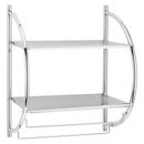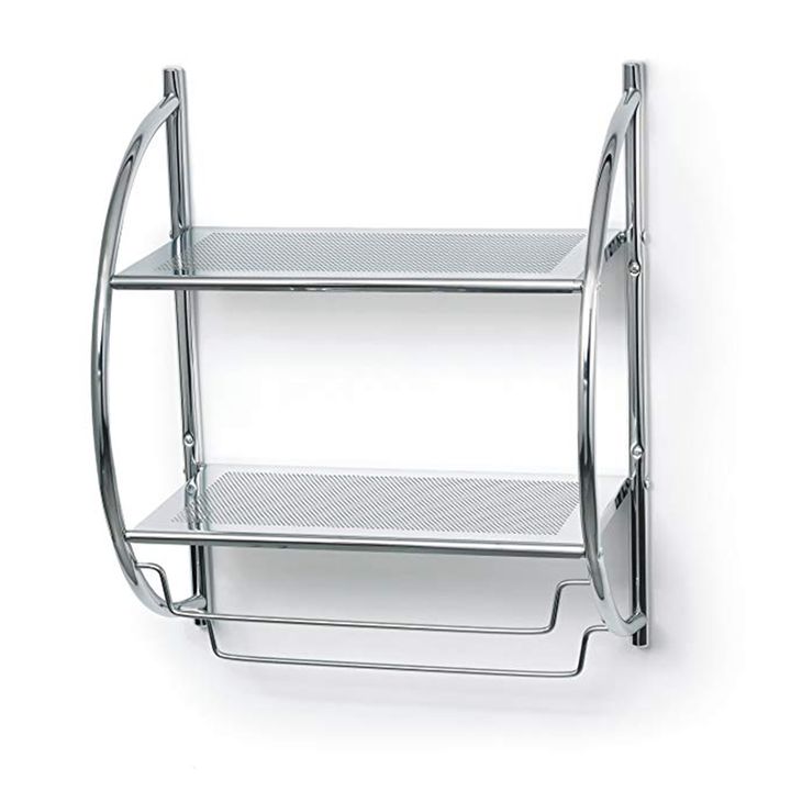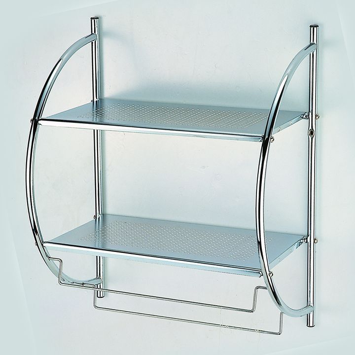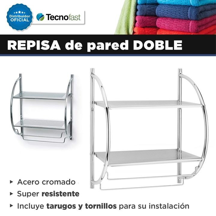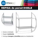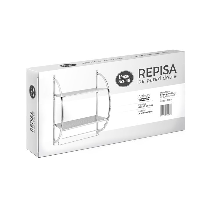 REPISA DE PARED DOBLE DE ACERO CROMADO Modelo: 142287 Características • Material: Acero Cromado • Super resistente • Medidas: 45 cm x 25 cm x 55 cm • Incluye tarugos y tornillos para su instalación • La imagen del packaging es meramente ilustrativa