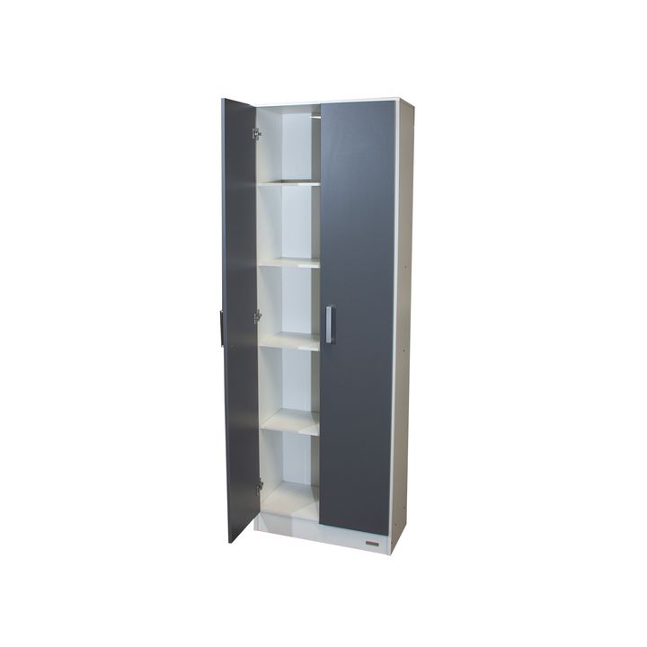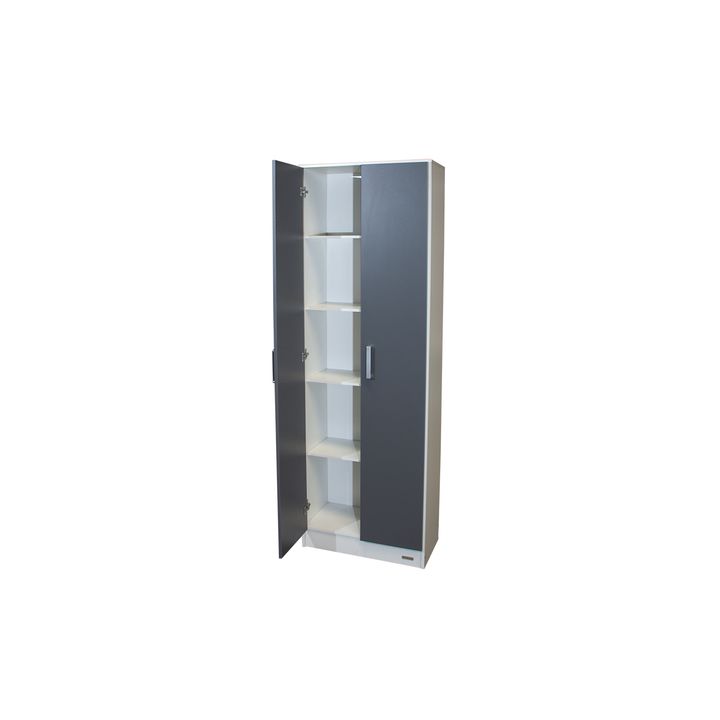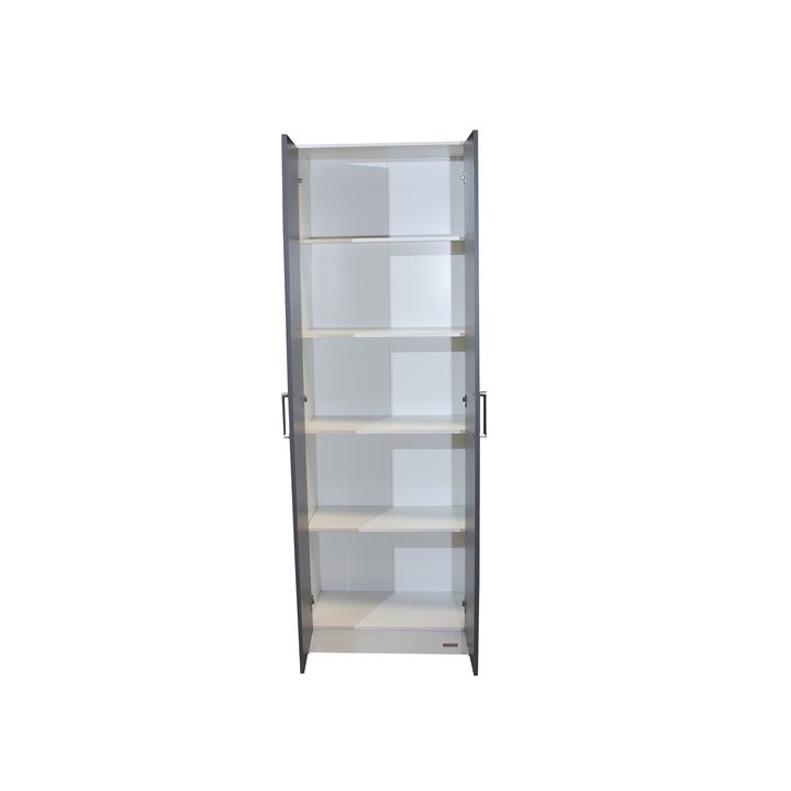 Organizador multifunción de melamina. Dos puertas con tiradores plásticos. Cinco estantes fijos. Interiores revestidos. Color Blanco y Gris Grafito. Medidas: Ancho: 0.61 mts. Alto: 1.83 mts. Profundidad: 0.31 mts. Productos Seleccionado para venta y entrega “EN CAJA”.