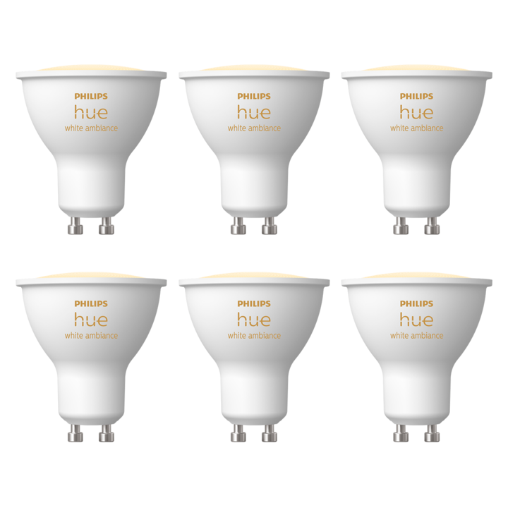 ¨Pack x6 focos* Foco LED Inteligente Philips Hue White Ambiance GU10 400 lm Los focos Philips Hue White Ambiance GU10 están diseñados para darle a tus espacios la luz adecuada en cada momento. Gracias a su tecnología LED inteligente, ofrecen una iluminación blanca regulable desde tonos cálidos hasta...