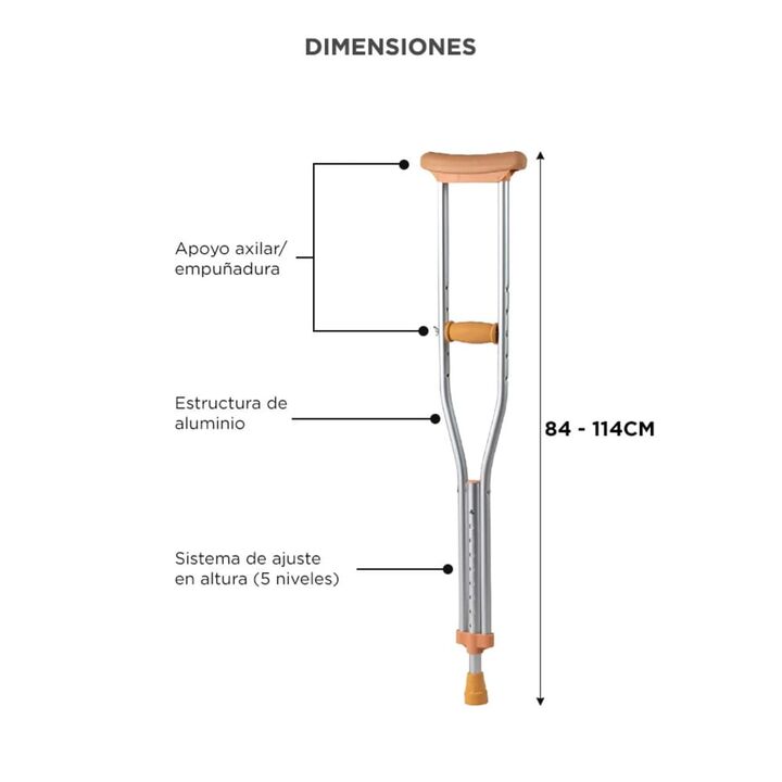 Estructura de aluminio liviana: Fabricadas en aluminio resistente que reduce el peso y facilita el uso diario sin generar cansancio en brazos ni hombros. Altura regulable en 5 niveles: Sistema de ajuste simple que permite adaptar la muleta a diferentes estaturas para una postura más cómoda y segura....
