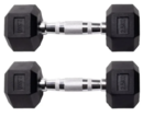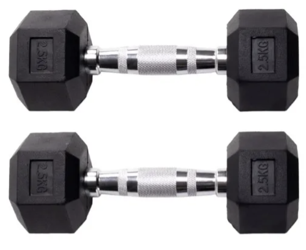 Par de mancuernas hexagonales engomadas mango cromado 2.5 Kgs cada una. Ampliamente utilizadas en gimnasios y hogares para gran variedad de ejercicios. Una gran herramienta para ejercitar el cuerpo completo, o grupos musculares específicos. Producto importado de excelente calidad. Ideales para brazo...