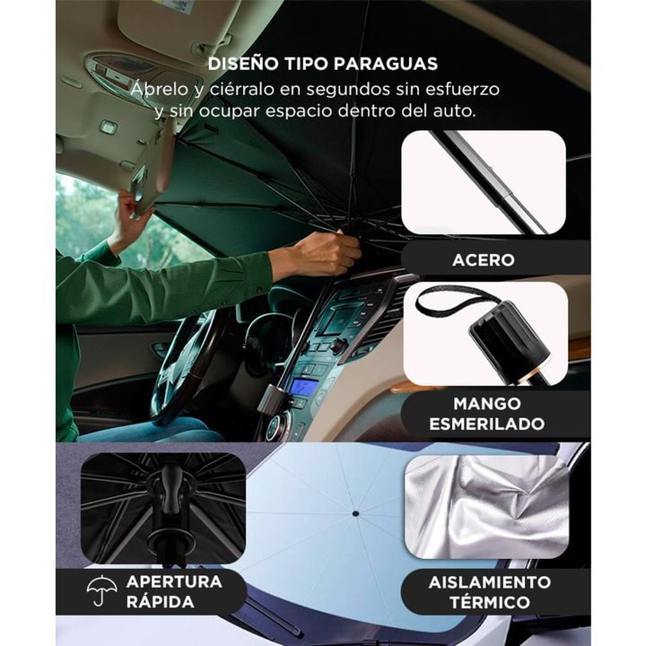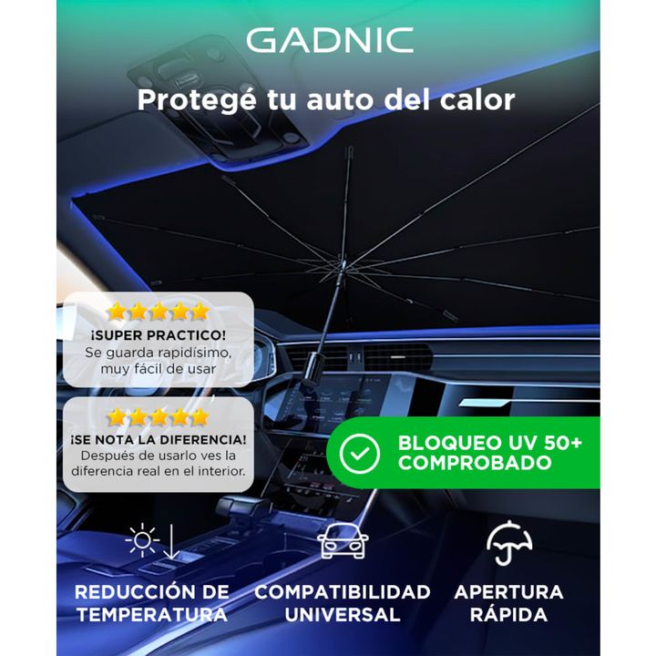 Protección solar eficaz para tu vehículo El Parasol plegable Gadnic bloquea los rayos UV y evita que el interior del auto se recaliente. Su tamaño de 78 × 140 cm cubre eficazmente parabrisas de autos, camionetas y SUV, protegiendo tapizados y tablero del desgaste o decoloración por exposición solar....