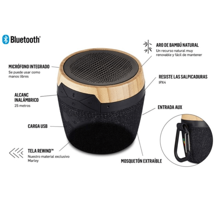 Parlante Bluetooth House Of Marley Chant Mini EM-JA007-SB Parlante Bluetooth, este mini milagro entrega un mundo de sonidos de alta calidad. Diseñado con materiales reciclado y detalles de bamboo. Tiene la capacidad de parearse con cualquier dispositivo y su portabilidad lo hace aún más deseado. Par...