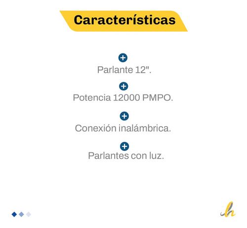 Modelo: KJ-JAZZ Marca: Kanji Garantía: 12 meses CARACTERÍSTICAS: - Parlante 12 - Potencia 12000 PMPO. - Con control remoto. - Conexión inalámbrica. - Parlantes con luz. - Radio FM. - Entrada USB, SD. Sku:73498