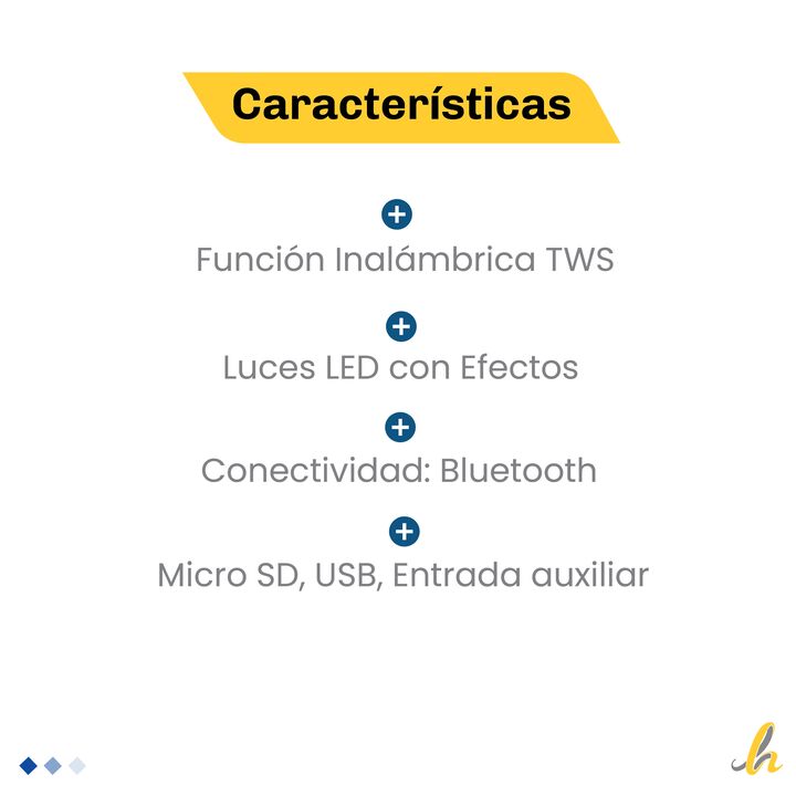 Modelo: D12 Marca: KANJI - Conectividad Bluetooth - Tarjeta Micro SD - Pendrive USB - Cuenta con entrada auxiliar - Función Inalámbrica TWS - Luces LED con Efectos - Batería Recargable: puerto USB Tipo-C - Voltaje: 220V MEDIDAS Alto: 20 cm Ancho: 10 cm Profundidad: 10 cm Sku: 73065 Garantía: 12 mese...