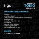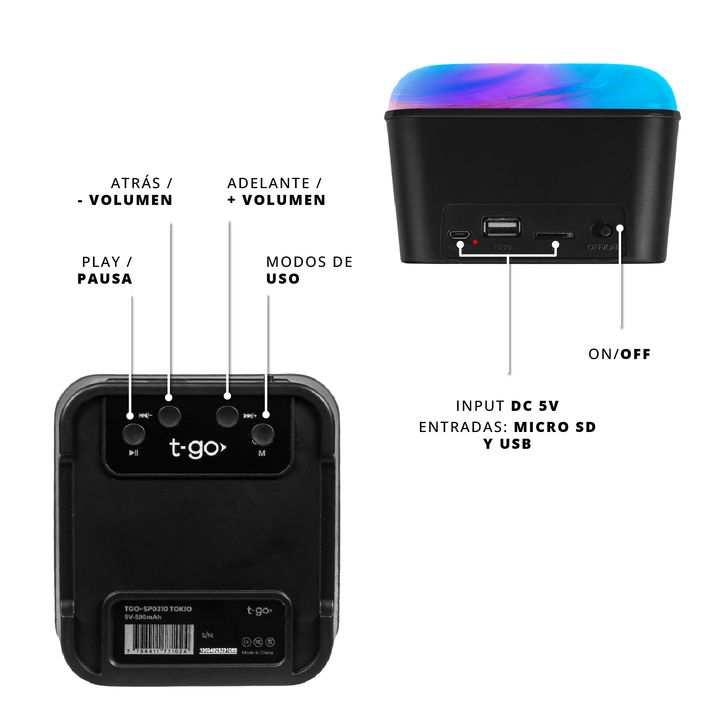 T-GO PORTABLE E INALÁMBRICO CON LUCES Y RADIO FM -Parlante de 3 pulgadas. -Tecnología TWS (podés emparejar dos parlantes iguales). -Bluetooth 5.0: mayor alcance, velocidad de transferencia de datos y menor consumo. -Luces RGB. -Radio FM. -Cable de carga, puede conectarse a un cargador convencional d...