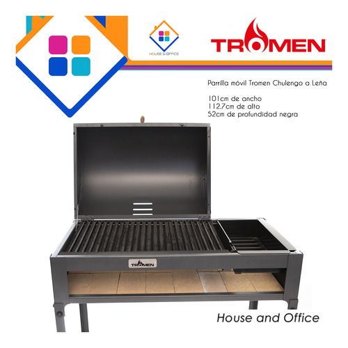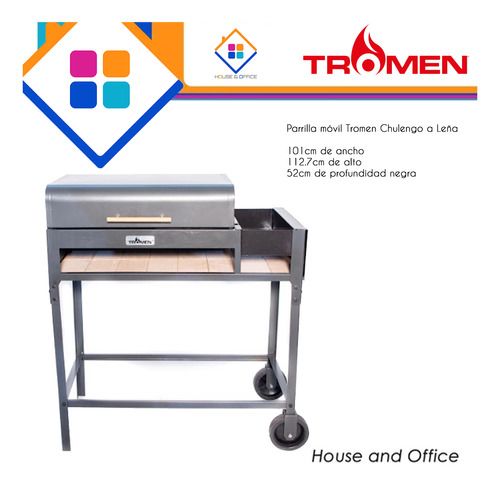 PARRILLA MÓVIL TROMEN CHULENGO A LEÑA 101CM DE ANCHO 112.7CM Marca:Tromen Código: 02-000-041T PARRILLA A LEÑA Chulengo a leña con tapa. Dimensiones ANCHO: 101 (CM) ALTO: 112.7 (CM) PROF. 52 (CM) PESO : 39 Kg Características *3 Modulos parrilla *1 Fogonero enlozado *16 Ladrillos refractarios *1 Base ...