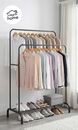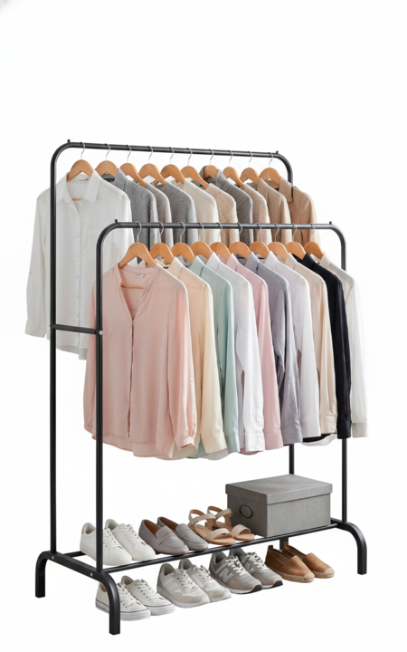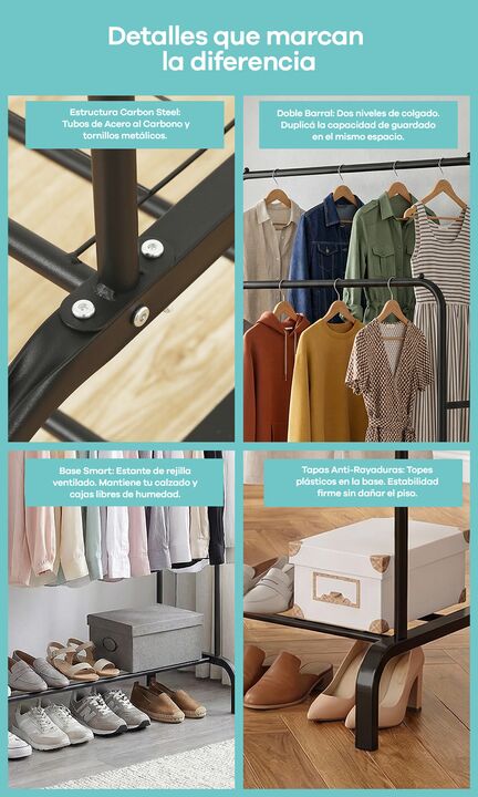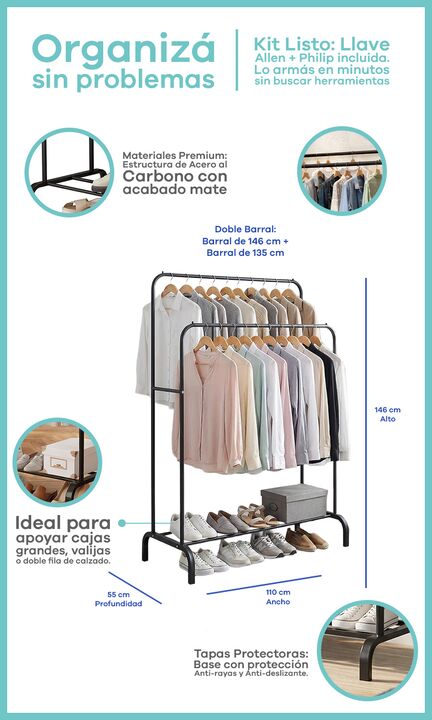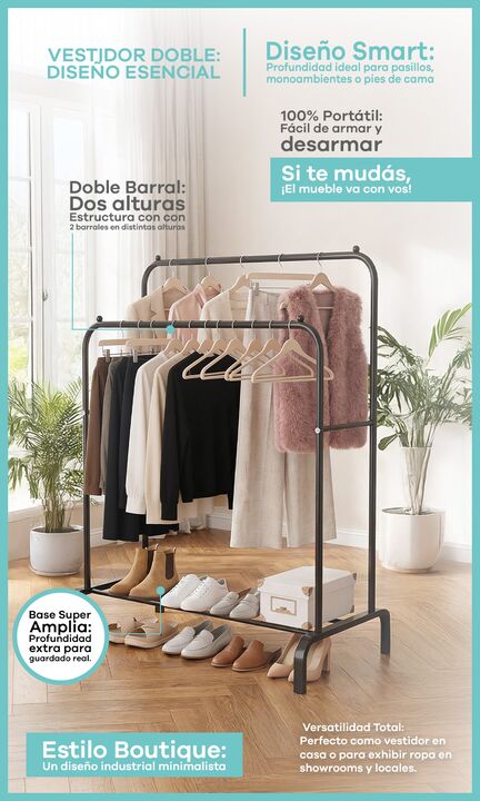 Perchero de pie Vestidor Doble Barral de Acero con base para calzados -100% Portátil: Fácil de armar y desarmar. Si te mudás, ¡el mueble va con vos! -Estilo Boutique: Un diseño industrial minimalista que exhibe tus prendas sin invadir el espacio -Doble Barral: Estructura con 2 barrales en distintas ...