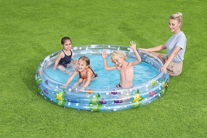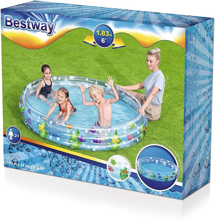 Pileta Inflable Infantil 3 aros Bestway 183x33cm Modelo: 51005 Veranos más frescos y divertidos con tu pileta inflable. • Fabricada en vinilo. • Medidas: 183cm de diámetro x 33cm de altura. • Edad mínima recomendada: 2 años. • Kit de reparación incluido. • Capacidad de agua: 480 L • Incluye kit de r...