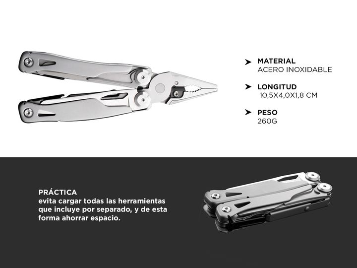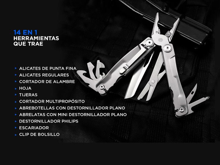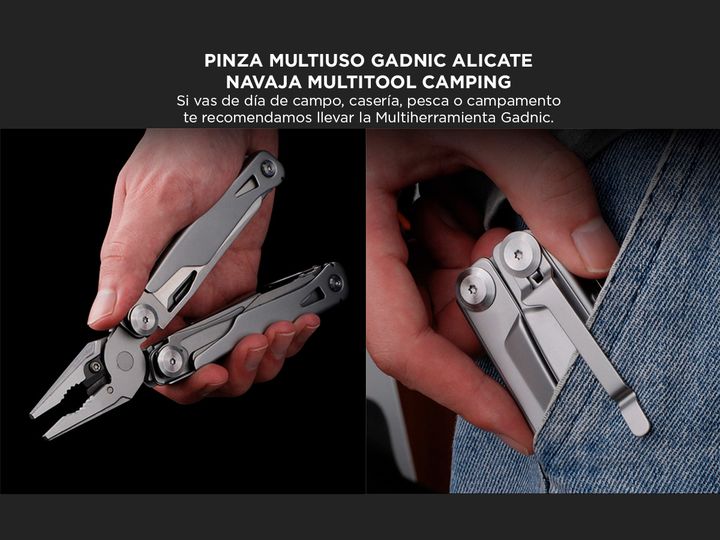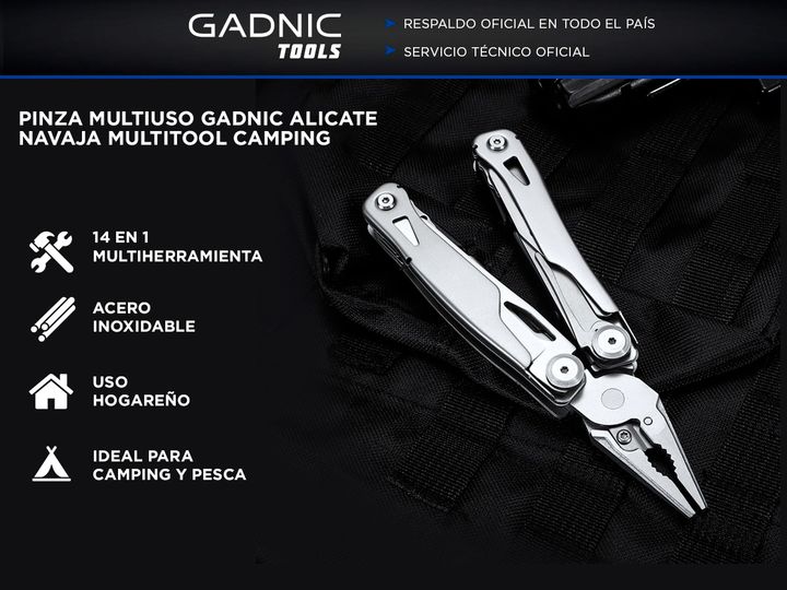 ¡Nueva Pinza Multiuso Gadnic Alicate Navaja Multitool Camping! Si vas de día de campo, casería, pesca o campamento te recomendamos llevar la Multiherramienta Gadnic Es tan práctica que te evita cargar todas las herramientas que incluye por separado, y de esta forma ahorrar espacio. Especificaciones ...