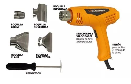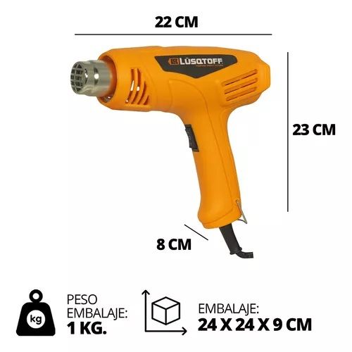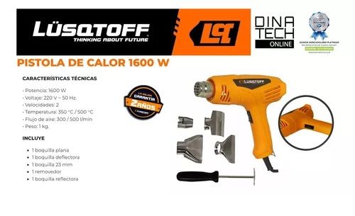 PISTOLA CALOR LUSQTOFF PCL1600-7 1600W 2 NIVELES TEMPERATURA PCL1600-7 CARACTERÍSTICAS: • Potencia: 1600W • 2 NIVELES DE CALOR / CAUDAL DE AIRE. • Temperatura Aire - Caudal: - Nivel 1 350 °C - 300l/Min - Nivel 2: 500 °C - 500l/Min • Incluye 4 boquillas: - 1 Boquilla plana - 1 Boquilla deflectora - 1...