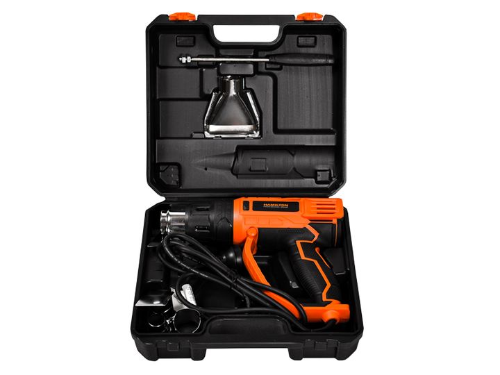 HAMILTON PISTOLA DE CALOR ELECTRICA 2000w MODELO: HPC002 2000W Motor eléctrico brushed de alta performance – Tensión nominal: 220V – 240V – Frecuencia: 50/60 Hz – Potencia: 2000W – Don niveles de temperatura: 350ºC / 600ºC – Caudal regulable: 300/500 Litros/minuto – Interruptor On-OFF con selector d...