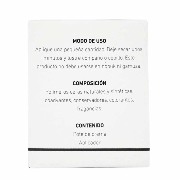 Crema siliconada para cuero que además de cuidar el producto, lo hidrata. Beneficios: limpia, protege y mantiene el cuero de todos los colores. Modo de uso: Remover el polvo/suciedad del calzado con un cepillo suave antes de aplicar la crema. Aplicar la crema en cantidad moderada con el aplicador,...