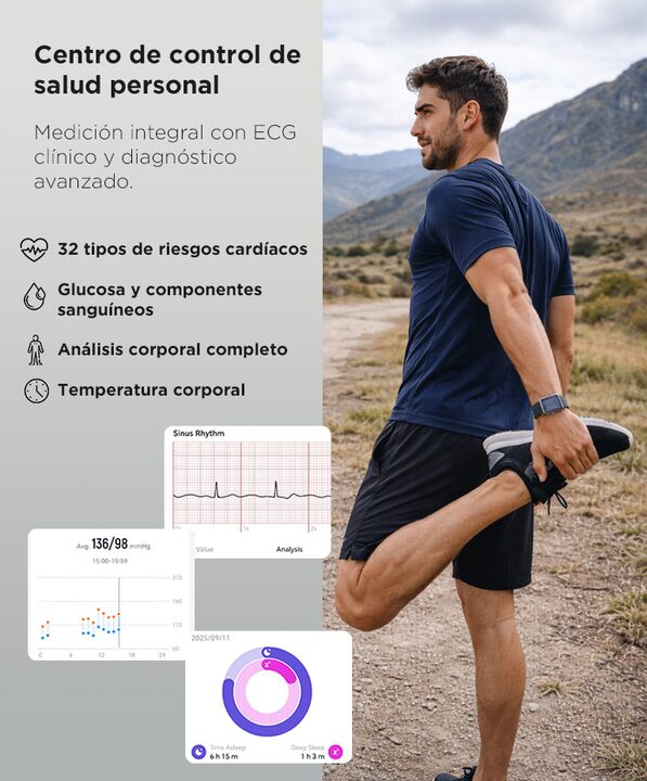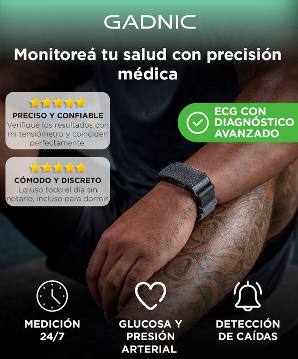 SALUD AVANZADA Y MONITOREO INTEGRAL La pulsera inteligente Gadnic VITRO ofrece monitoreo biometrico continuo las 24 horas con enfoque en salud preventiva y control personal. Integra ECG con diagnostico capaz de evaluar 32 tipos de riesgo cardiovascular junto con medicion de glucosa presion arterial ...