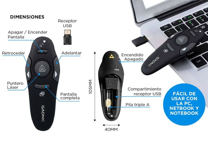 ¡Presentamos el nuevo Presentador Inalámbrico con Puntero Láser Gadnic Smart 2.4GHz! Este innovador presentador es el aliado perfecto para tus reuniones y presentaciones, diseñado con tecnología de radiofrecuencia inalámbrica de 2.4GHz que asegura un rango de hasta 30 metros sin interferencias. Su d...