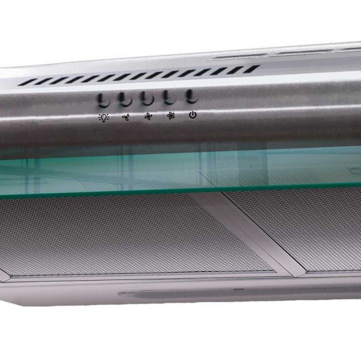 Potencia 112 Watts. Potencia 250m3 h poder de succion. 2 filtros de aluminio de 5 capas. Cuerpo de acero inoxidable 60cm de ancho. Incluye conector plastico para salida de aire. Adaptable para instalacion con o sin salida al exterior. 3 velocidades y 1 lampara LED de 2 Watts. Deflector de vidrio Fil...