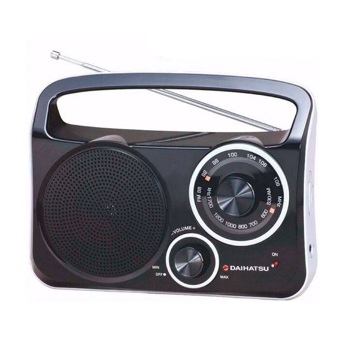 Marca Daihatsu Modelo D-RP400 Color Negro Tipo de producto Radio reproductor Cantidad de parlantes 1 Alimentación 4 pilas tipo «C» Control remoto: No Radio AM, FM Alto 15 cm. Dimensiones: 215x69x162mm Garantía 1 año Origen China