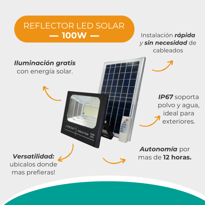Presentamos el reflector solar Nexum 100W la solucion perfecta para iluminar tus areas al aire libre de manera eficiente ecologica y sin complicaciones. CARACTERISTICAS DESTACADAS Potencia de 100W para una iluminacion intensa y uniforme. Tecnologia solar avanzada que aprovecha la energia del sol dur...