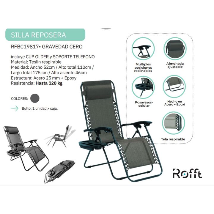 REPOSERA ROFFT GRAVEDAD CERO CON APOYA VASOS Y PORTA CELULAR Marca:Rofft Código: RFBC19817 SILLA REPOSERA GRAVEDAD CERO Incluye CUP HOLDER y SOPORTE TELEFONO Material: Teslin respirable Medidas: Ancho 52cm / Alto total 110cm / Largo total 175 cm Alto asiento 46cm Estructura: Acero 25 mm + Epoxy Resi...