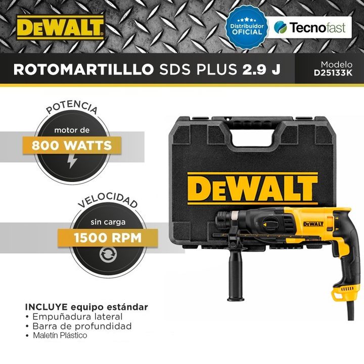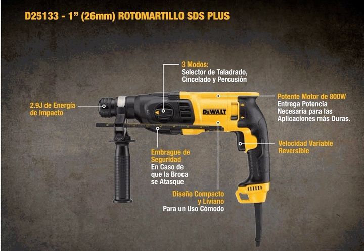Rotomartillo SDS Plus - Dewalt Modelo: DWD25133K Caracteristicas: • Ideal para taladrar agujeros para fijaciones o para pasamuros en hormigón o mampostería desde 4 a 26 mm de diámetro • Parada de rotación para realizar pequeñas demoliciones en ladrillo, materiales de construcción blandos y ocasional...