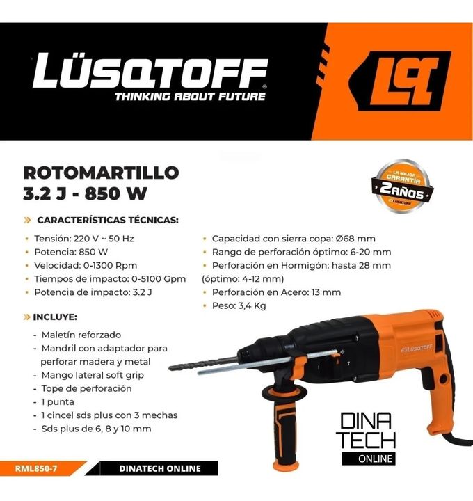 Rotomartillo Taladro Percutor Lusqtoff RML850-7 horizontal RML850-7 El rotomartillo perforador horizontal Lusqtoff RML850-7 cuenta con rotación para atornillar y desatornillar, rotación con percusión, para perforar y cincelar en madera, piedra y plástico, cuenta con 2 rotores en la misma herramienta...