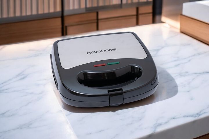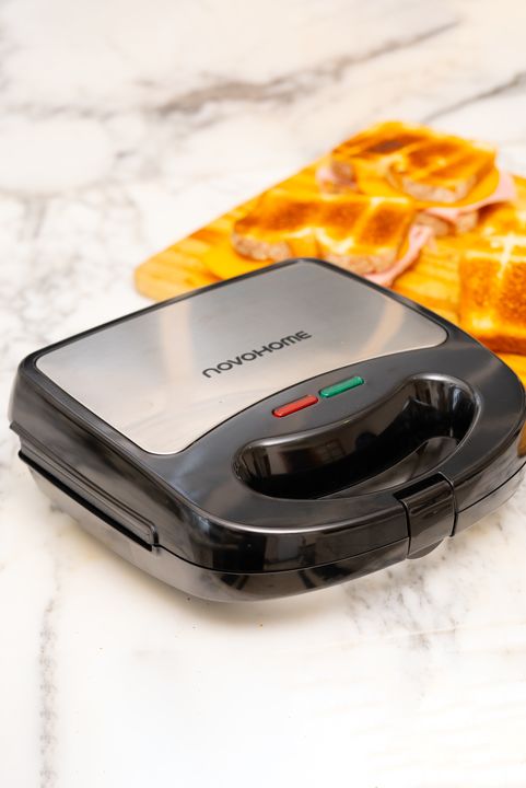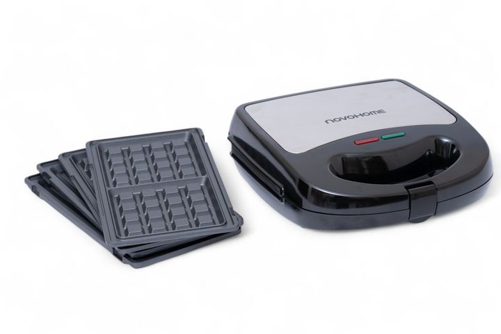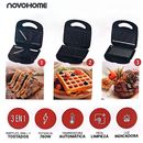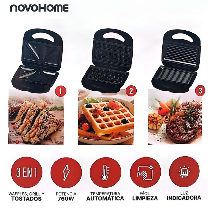 NOVOHOME SANDWICHERA X3 SKU: NH-SM1200 Especificaciones técnicas: - Placas antiadherentes - Placas intercambiables para: wafles, tostados y grill - Con luces indicadoras de uso - Superficie de acero inoxidable - Temperatura automática - Mango frío al tacto, seguro de usar - Traba de seguridad - Pote...