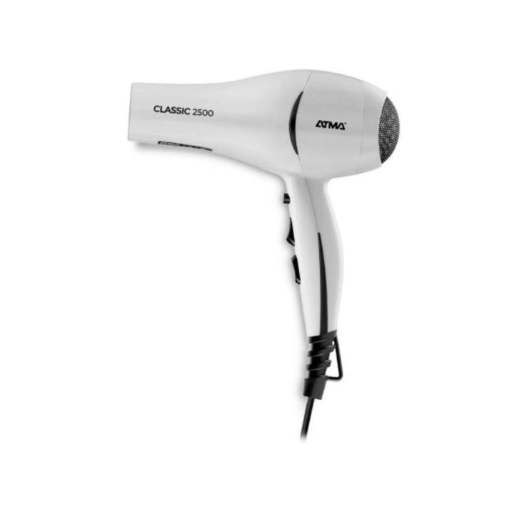 Secador de Pelo Atma Classic 2500 Blanco con 1800W, 3 temperaturas, aire frío y boquilla concentradora. Lográ un secado rápido y profesional. ¡Compralo ahora!